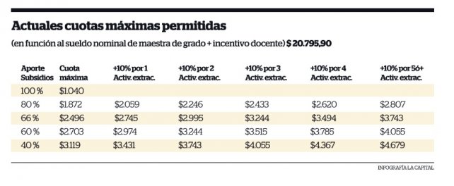 Los establecimientos que perciben el mÃnimo de aportes (40 por ciento) y brindan cinco o más actividades extra tienen hoy como techo máximo para cobrar en las cuotas 4.679 pesos, que se irá a unos 5.100 pesos desde septiembre.