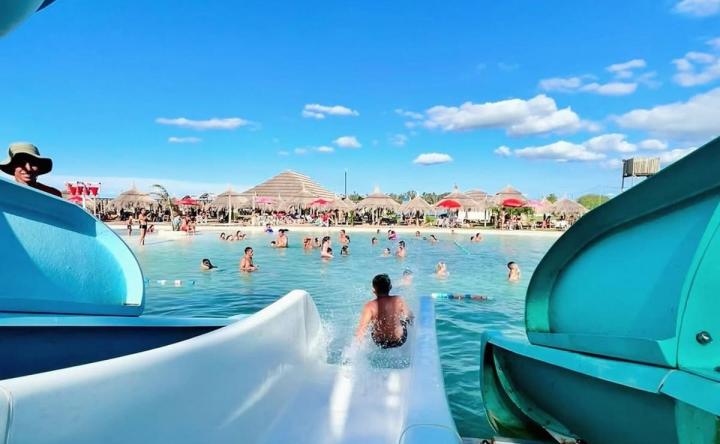El complejo cuenta con una piscina playa de 1500 m², complementada por toboganes que garantizan la diversión acuática.