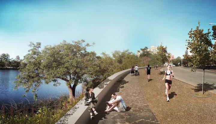 La segunda intervención clave fue la creación de un paseo costanero en el tramo comprendido entre el Museo Etnográfico y la Escuela San Francisco, a partir de la remoción de la valla existente, el ensanche y reemplazo de veredas, la iluminación peatonal por columnas, la apertura de cinta verde y arbolado y la construcción de una bancada corrida que será a la vez un balcón mirador del lago.