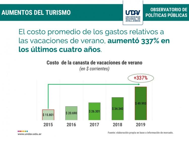 El Observatorio de Políticas Públicas de la Universidad Nacional de Avellaneda (Undav) estableció que los gastos relativos a las vacaciones del periodo 2015 al 2019 se incrementaron en el orden del 337 %.