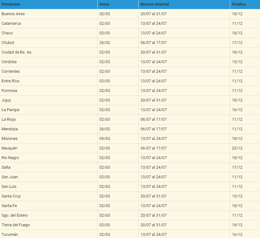 Salvo tres provincias, todas las jurisdicciones empezarán las clases el 2 de marzo. Tanto la provincia de Buenos Aires, como Capital Federal, Jujuy, Santiago del Estero, Santa Cruz y Tierra del Fuego tendrán el receso invernal del 20 al 31 de julio. Todos estos distritos planean finalizar el ciclo el 18 de diciembre, mientras que Santa Cruz lo hará el 15.