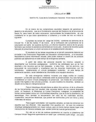 En la misma circular, la cartera educativa informa que este jueves se pone en marcha la plataforma de Campus Virtual “Seguimos aprendiendo en casa”.