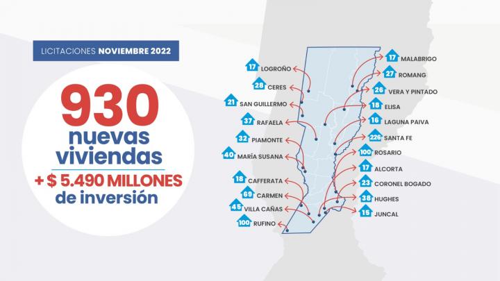 La administración de Omar Perotti, a través del Ministerio de Infraestructura, Servicios Públicos y Hábitat, licitará entre el 7 y el 22 de noviembre la construcción de 930 unidades habitacionales para 20 localidades de la provincia, para lo que se destinará un monto superior a los 5.490 millones de pesos.