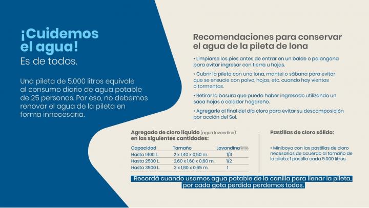 > Cubrir la pileta con una lona o plástico mientras no la usemos para evitar el ingreso de polvo u hojas que afectan el estado de conservación del agua.