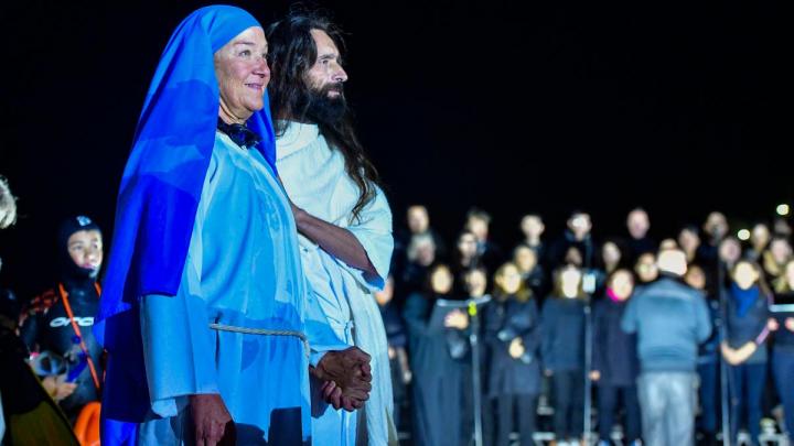 Un murmullo y aplausos desde el muelle y la playa, donde se amontona el público, estalla cuando emerge de las aguas el actor que personifica a Cristo -es recibido por otros actores que interpretan a habitantes de la época- y mucho más cuando aparece la cruz iluminada que es colocada junto a la otra cruz, la traída desde la tierra que ya está enclavada en la arena, y los coros de todas las iglesias comienzan a entonar himnos.