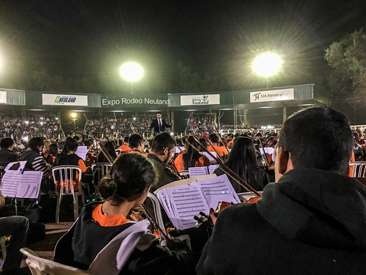 El turno de SOS Música llegaría el martes, en el Polideportivo, donde interpretaron un repertorio compuesto por chacarera, tangos, una milonga y la popular melodía de “Amores como el nuestro”, en la voz del profesor Joaquín Vivo. La energía de la Orquesta se contagió al público de Neuland que por primera vez en todo el Festival pidió bis, y se puso a bailar cuando volvió a sonar la cumbia.