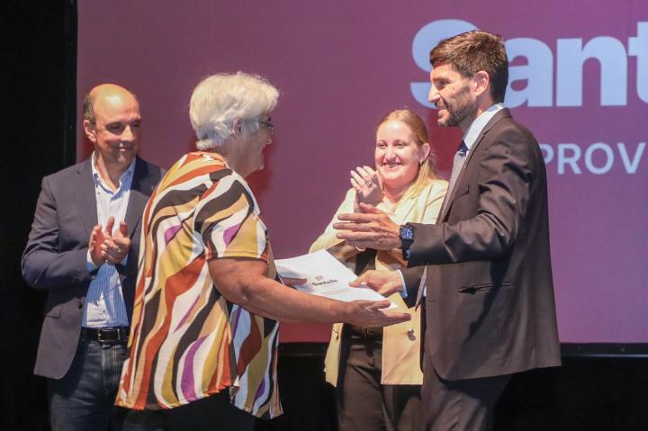 El gobernador de la provincia, Maximiliano Pullaro, junto a los ministros de Igualdad y Desarrollo Humano, Victoria Tejeda, y de Gobierno e Innovación Pública, Fabián Bastia, participó del acto de entrega de escrituras a propietarios de las ciudades Santa Fe, Santo Tomé, Rincón y el barrio costero de la ciudad capital, Colastiné.
