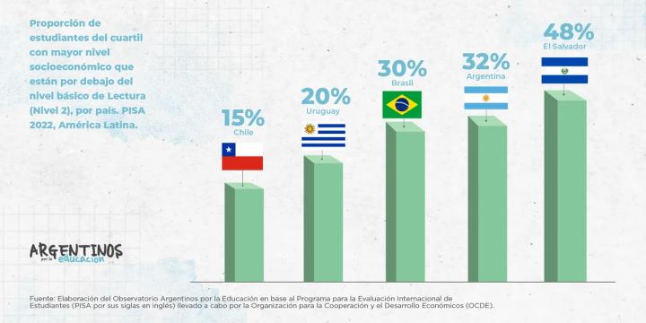 Que en Argentina el 32% de los alumnos de 15 años del nivel socioeconómico más alto no alcance el nivel mínimo de Lectura en la prueba PISA 2022 constituye una performance peor que la de países como Chile (15%), Uruguay (20%), Colombia (24%), Perú (27%) y México (27%), que tienen menos estudiantes del cuartil más favorecido con aprendizajes por debajo del nivel esperado.
