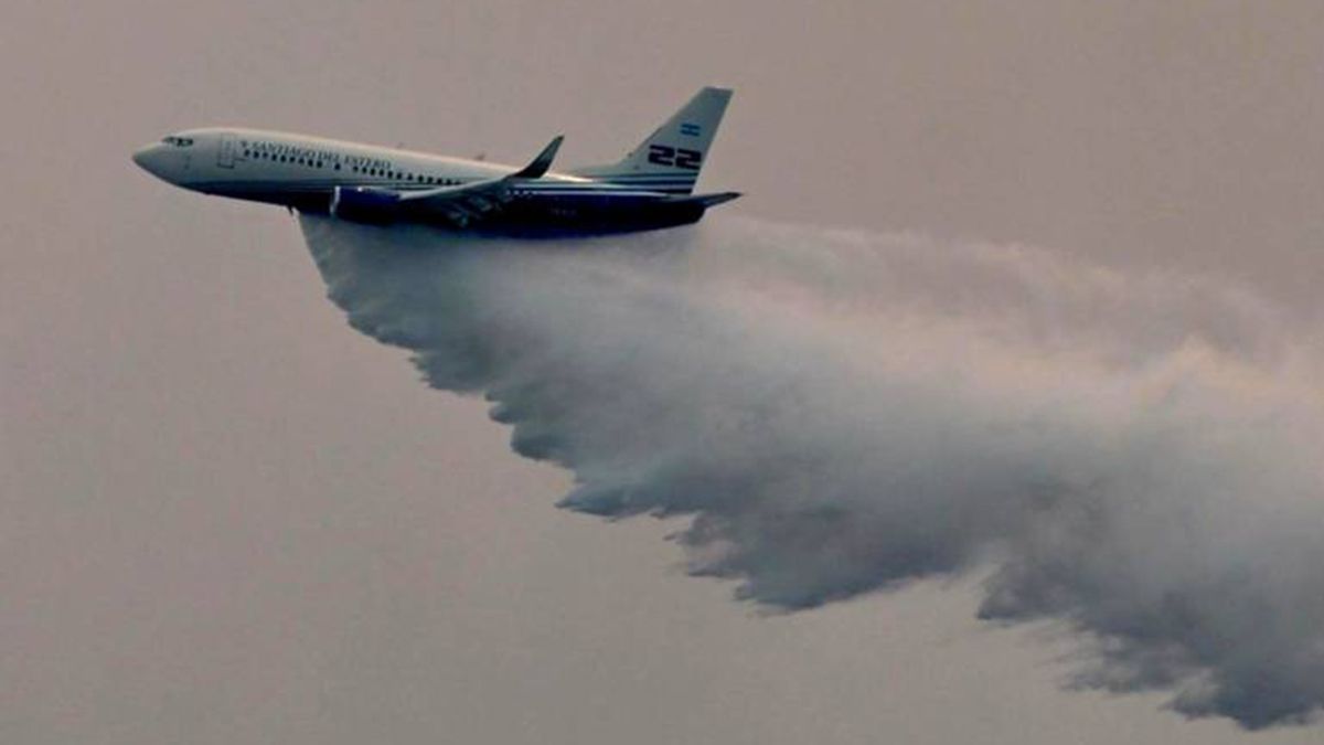 El Boeing 737 Fireliner, perteneciente a la provincia de Santiago del Estero, arribó a la ciudad de Esquel el miércoles y realizó sus primeras descargas el jueves alrededor de las 16 sobre la ladera del cerro Pirque, uno de los sectores más comprometidos del incendio de Puerto Patriada.