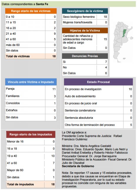 Con 18 muertes durante el 2016, Santa Fe ocupa el cuarto puesto del total de femicidios perpetuados en todo el país. Según los datos brindados por la Corte Suprema de Justicia, 15 niñas/os o adolescentes se quedaron sin mamá, el 77 % de los imputados por las muertes eran pareja o familiares de las víctimas y el 38 % de las mujeres había realizado una denuncia previa.
