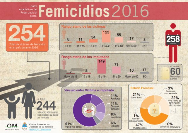 A nivel nacional, el número de víctimas ascendió a 254 y la tercera edición del Registro de Femicidios de la Corte Suprema de Justicia incluyó por primera vez los transfemicidios/travesticidios. Fue la vicepresidenta de la Corte Suprema de Justicia de la Nación, Elena Highton de Nolasco, titular de la Oficina de la Mujer y de la Oficina de Violencia Doméstica, quien presentó la edición correspondiente a los femicidios perpetrados en el año 2016.