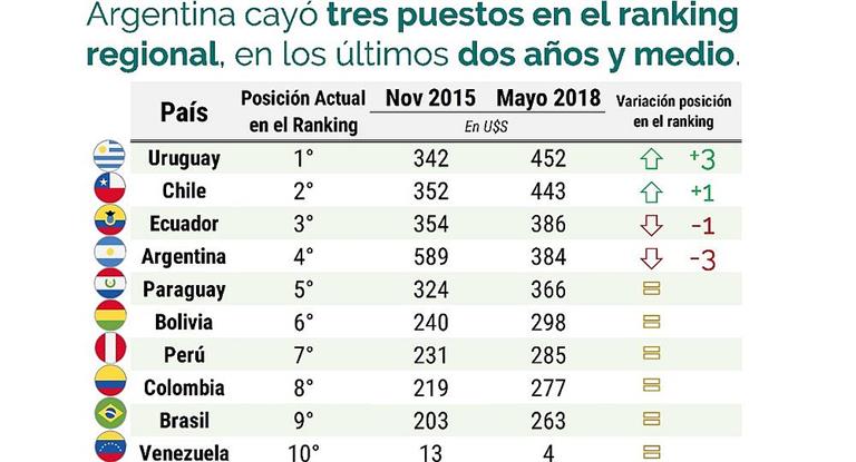 Luego de la abrupta devaluación que dejó la crisis cambiaria, la Argentina cayó de la primera a la cuarta posición en el ranking regional de salarios mÃnimos medidos en dólares.